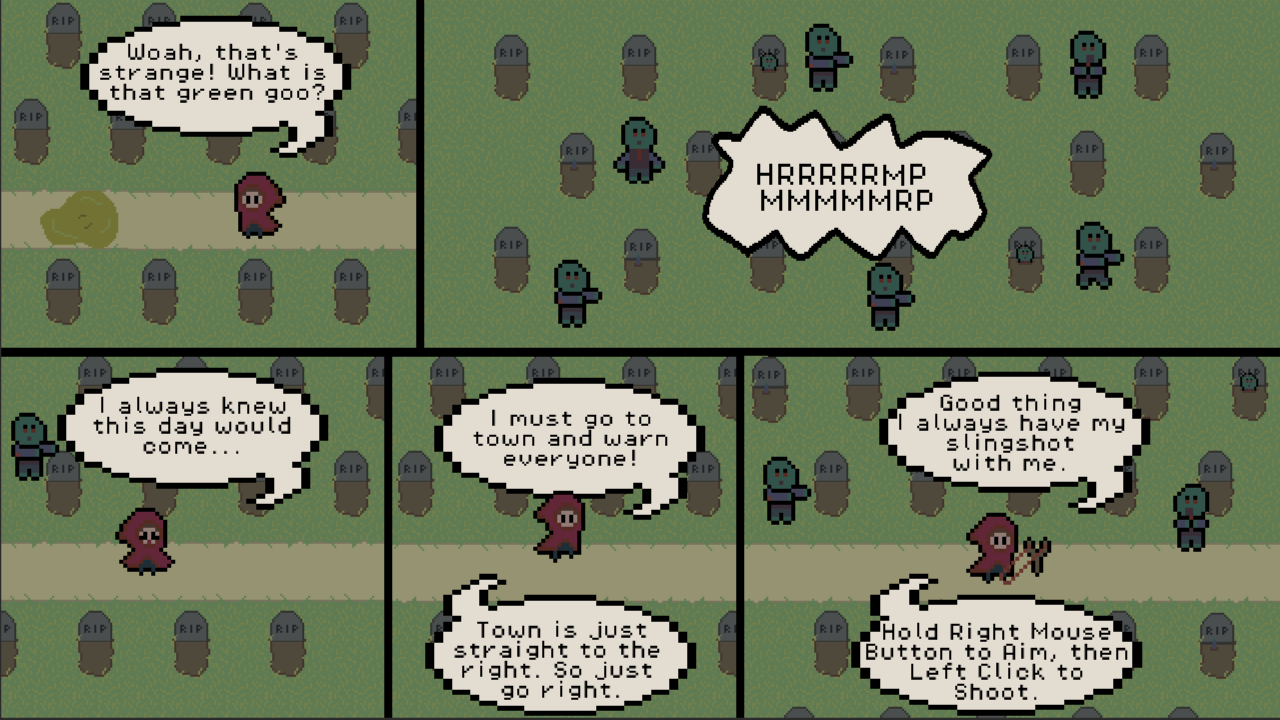 While walking in the cemetery, you spot some strange green goo. Then you see the dead begin to rise from their graves and walk towards you. Quickly, you must warn the town of undead. Luckily, you have your slingshot with you to defend yourself.
